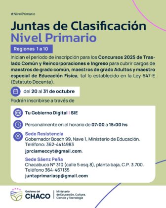El Ministerio de Educación del Chaco, a través de las Juntas de Clasificación de Nivel Primario de las Regiones 1 a 10, informó que desde el 20 hasta el 31 de octubre se encuentra abierto el período de inscripción para los Concursos 2025 de Traslado Común, Reincorporaciones e Ingreso.