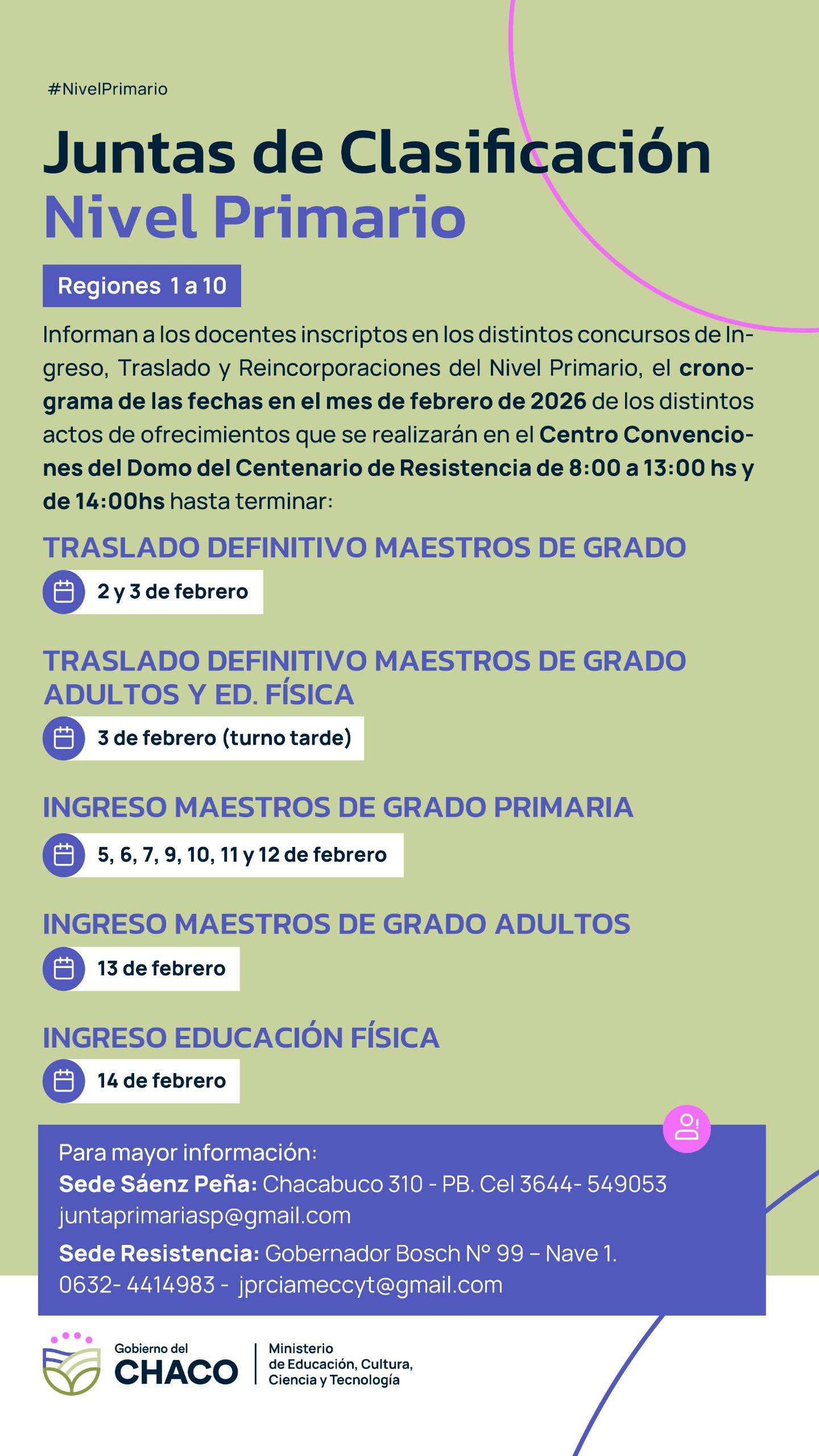 El Ministerio de Educación, a través de las Juntas de Clasificación de Nivel Primario, con sedes en Presidencia Roque Sáenz Peña y Resistencia -que abarcan a todas las Regiones Educativas de la provincia- informa a los docentes inscriptos en los concursos de Ingreso, Traslado y Reincorporaciones del Nivel Primario el cronograma de los actos de ofrecimiento de cargos correspondientes al mes de febrero de 2026.