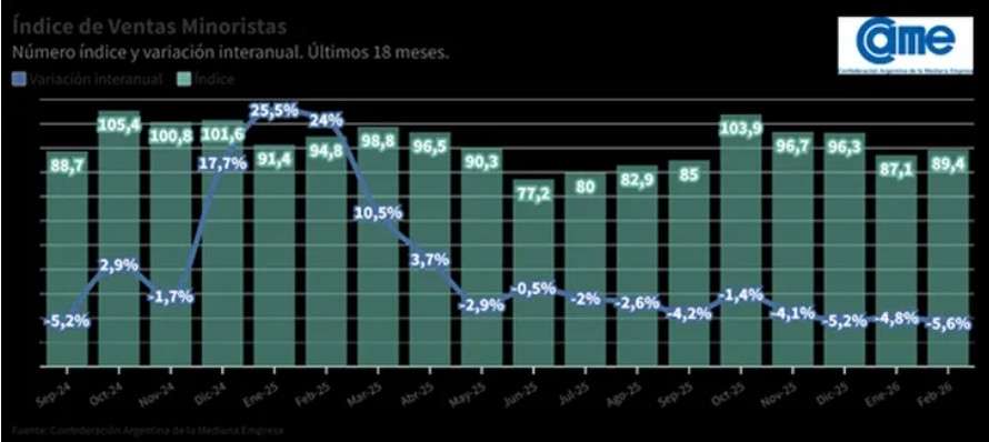 El dato surge del último relevamiento de la Confederación Argentina de la Mediana Empresa (CAME), que además señaló que el indicador acumula una retracción del 5,2% en el primer bimestre de 2026, reflejando que el consumo todavía no logra consolidar una recuperación sostenida.