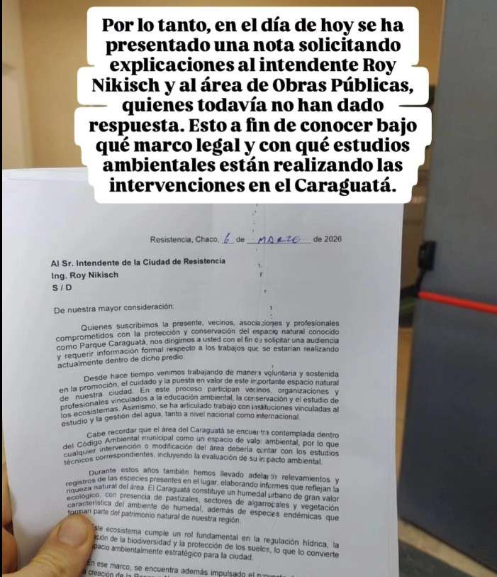 Ante el avance de las máquinas, se presentó una nota formal dirigida al intendente de Resistencia, Roy Nikisch, solicitando precisiones sobre la intervención en el predio y bajo qué normativa se ejecutan las tareas.
