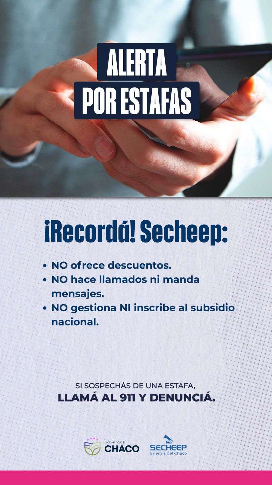 Desde la empresa provincial remarcaron que Secheep NO realiza este tipo de gestiones y pidieron a la población extremar precauciones para evitar caer en engaños. En ese sentido, recordaron que la empresa no ofrece descuentos a través de llamados o mensajes, no se comunica con los usuarios para solicitar datos personales y tampoco gestiona ni realiza inscripciones al subsidio nacional de energía. Asimismo, indicaron que ante cualquier comunicación sospechosa, los usuarios deben cortar inmediatamente el contacto y realizar la denuncia correspondiente llamando al 911.