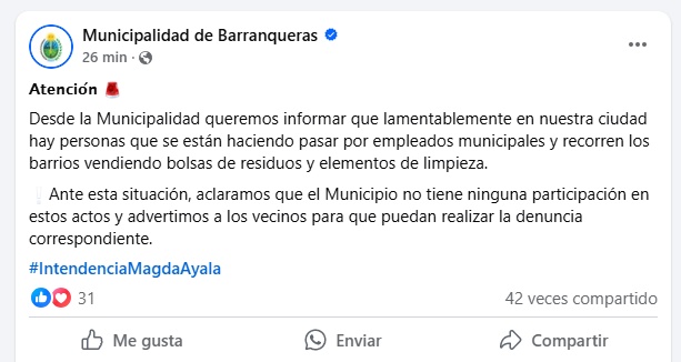 La Municipalidad de Barranqueras emitió una advertencia a la comunidad ante la detección de personas que, de manera fraudulenta, se presentan en distintos barrios haciéndose pasar por empleados municipales. Según informaron, estas personas ofrecen a la venta bolsas de residuos y productos de limpieza, en un accionar completamente ajeno a la gestión oficial.