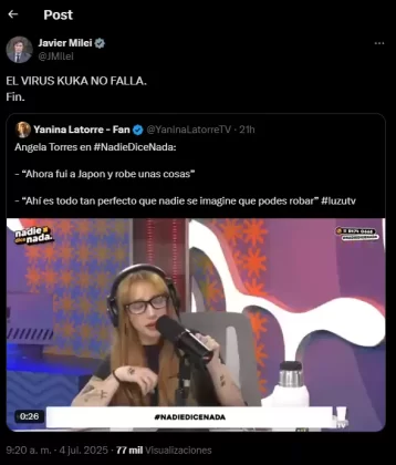 La reacción del presidente Javier Milei no se hizo esperar. Desde su cuenta oficial de X (antes Twitter), compartió el video junto a un mensaje contundente: “El virus kuka no falla. Fin.” Con esta frase, no solo criticó a Torres sino que la vinculó al kirchnerismo, en línea con la retórica que suele utilizar contra figuras del espectáculo que expresan opiniones políticas.