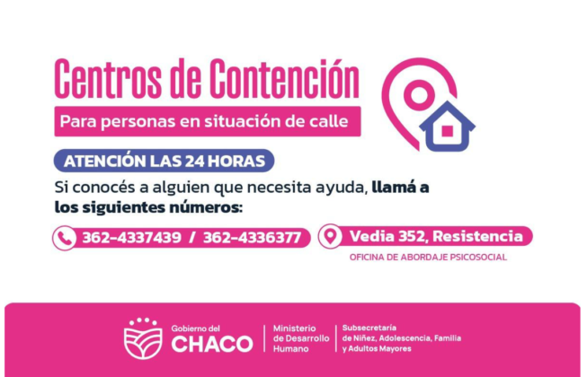 El Ministerio de Desarrollo Humano informa que, ante la ola de frío invernal, se encuentran cupos disponibles para el alojamiento y contención de personas en situación de vulnerabilidad social como es la de situación de calle. Las líneas telefónicas móviles para dar aviso son: 362-4337439 y 362-4336377.