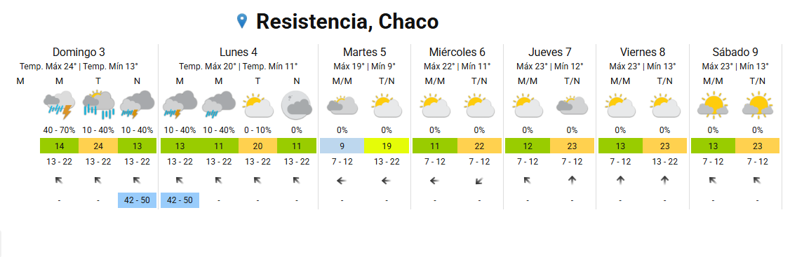 El Servicio Meteorológico Nacional informa que este domingo en Resistencia se esperan lluvias con una probabilidad de entre el 40% y el 70% durante la mañana. La temperatura oscilará entre una mínima de 13°C y una máxima de 24°C. Las precipitaciones podrían continuar a lo largo del día, aunque con menor intensidad.