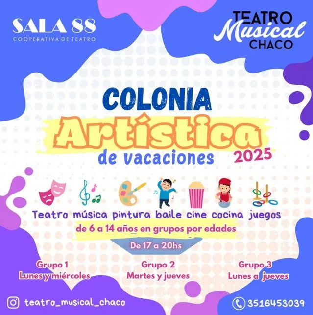 Sala 88 y Teatro Musical Chaco abrieron la inscripción para la colonia artística de vacaciones 2025. Las clases comenzarán el lunes 13 de enero y durarán hasta finales de febrero; serán en las instalaciones de la cooperativa, French 845. Para inscribirse se realiza en https://forms.gle/8EQbz4ZEe5gND5Mo8 o comunicarse al 3516453039. La inscripción no tiene cargo; pero se completa al abonar la cuota, que puede ser del mes o de la clase. Las clases serán de lunes a jueves de 17 a 20 y se puede elegir 3 grupos: lunes y miércoles,…