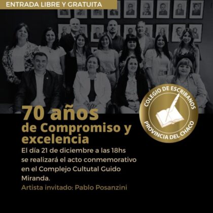 El sábado 21 de diciembre a las 18hs, se realizará en el Centro Cultural Guido Miranda, el acto en conmemoración del aniversario de la Institución. Durante el acto, con entrada libre y gratuita, se reconocerá la trayectoria de los profesionales y tendrá como cierre la presentación del Tenor Pablo Pozanzini. Los esperamos para celebrar juntos siete décadas de excelencia y compromiso