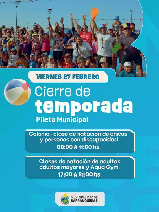 La Municipalidad de Barranqueras anunció el cierre de la temporada de verano en la Pileta Municipal, que se llevará a cabo el viernes 27 de febrero con una jornada cargada de actividades para toda la comunidad.
