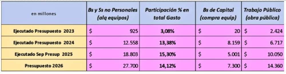 - Ambas partidas juntas no superan los $18.000 millones destinados en la ejecución presupuestaria, mayoritariamente a alquileres de maquinarias y camiones, sin prestación efectiva.