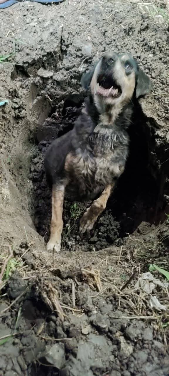 Tras el aviso de una vecina, una dotación acudió al lugar donde constató que un perro se encontraba atrapado dentro de un pozo de tierra, observando únicamente su cabeza.