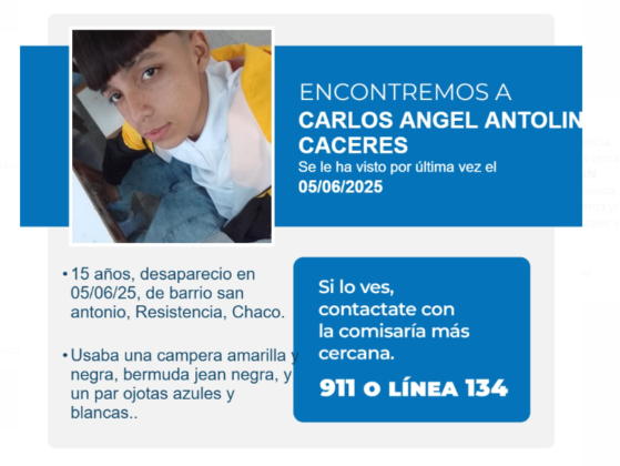 La Policía del Chaco en base a una denuncia registrada en Comisaria Quinta Resistencia, solicita colaboración para dar con el paradero de CARLOS ANGEL ANTOLIN CACERES, de 15 años.
