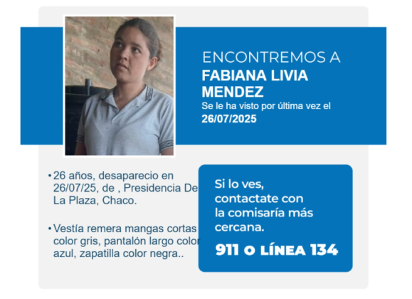 La Policía del Chaco, a través de la Comisaría de Presidencia de La Plaza, solicita la colaboración de toda la comunidad para dar con el paradero de Fabiana Livia Méndez, de 26 años, quien se encuentra desaparecida desde el sábado 26 de julio de 2025.