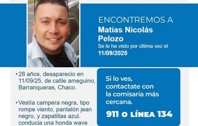 La Policía del Chaco lanzó un pedido de colaboración para dar con el paradero de Matías Nicolás Pelozo, de 28 años, desaparecido desde el jueves 11 de septiembre en la ciudad de Barranqueras.