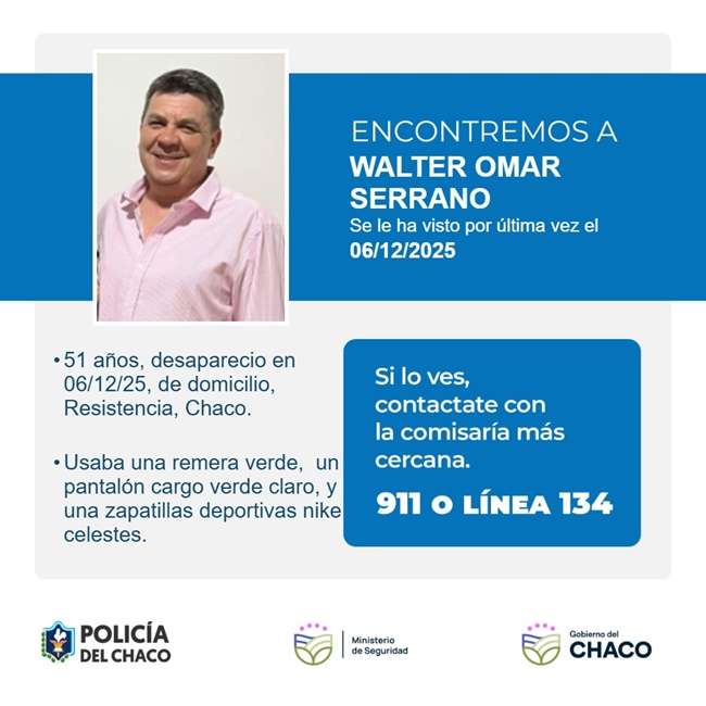 La Policía del Chaco emitió una solicitud de colaboración pública con el fin de dar con el paradero de Walter Omar Serrano, de 51 años, tras una denuncia presentada en la Comisaría Quinta Metropolitana. Según informaron las autoridades, Serrano fue visto por última vez el 6 de diciembre de 2025 en su domicilio y desde entonces no se ha tenido ninguna noticia sobre su ubicación.