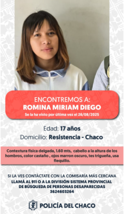 Las autoridades solicitan a la comunidad que, ante cualquier información que pueda contribuir a la localización de Romina, se comuniquen de inmediato con la comisaría más cercana o al número de emergencias 911.