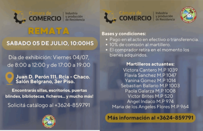 La Cámara de Comercio invita al gran remate de muebles y objetos de oficina, con exhibición el viernes 4 de julio y subasta el sábado 5 a las 10 horas. La exhibición será en el Salón Belgrano (Juan D. Perón 111, 3° piso), de 8 a 12 y de 17 a 19 horas.