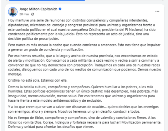 En un contundente mensaje político, el exgobernador chaqueño Jorge Milton Capitanich manifestó su rechazo a la sentencia contra la expresidenta Cristina Fernández de Kirchner, a quien calificó como “condenada políticamente por la vía judicial”. Según el mandatario, el fallo no representa un acto de justicia sino “una decisión política de proscripción” que atenta contra la democracia. Tras mantener reuniones con dirigentes provinciales, legisladores e intendentes, Capitanich anunció el estado de alerta y movilización en todo el territorio chaqueño, convocando a la militancia y a la ciudadanía a “dar la batalla cultural” y salir a las calles en defensa de Cristina. “No es tiempo de tibios —afirmó—, sino de valentía y convicciones firmes”, instando a enfrentar un modelo que, según denunció, solo genera exclusión, pobreza y desigualdad.