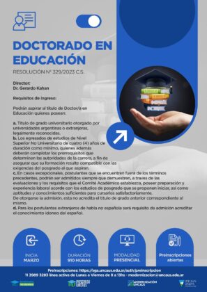 Las clases serán presenciales y comenzarán el 11 de marzo de 2025. Las mismas se extenderán por 24 meses. La Universidad Nacional del Chaco Austral (UNCAUS) abrió inscripciones para un Doctorado en Educación, que se realizará mediante Resolución Nº 329/2023- C.S. de la institución y que se encuentra acreditado por CONEAU según dictamen 617/2024. Las clases serán presenciales. La dirección de esta propuesta está a cargo del Dr. Gerardo Kahan. El perfil del egresado se orienta a la formación para la investigación, cuyos desarrollos y resultados contribuyan a la resolución…