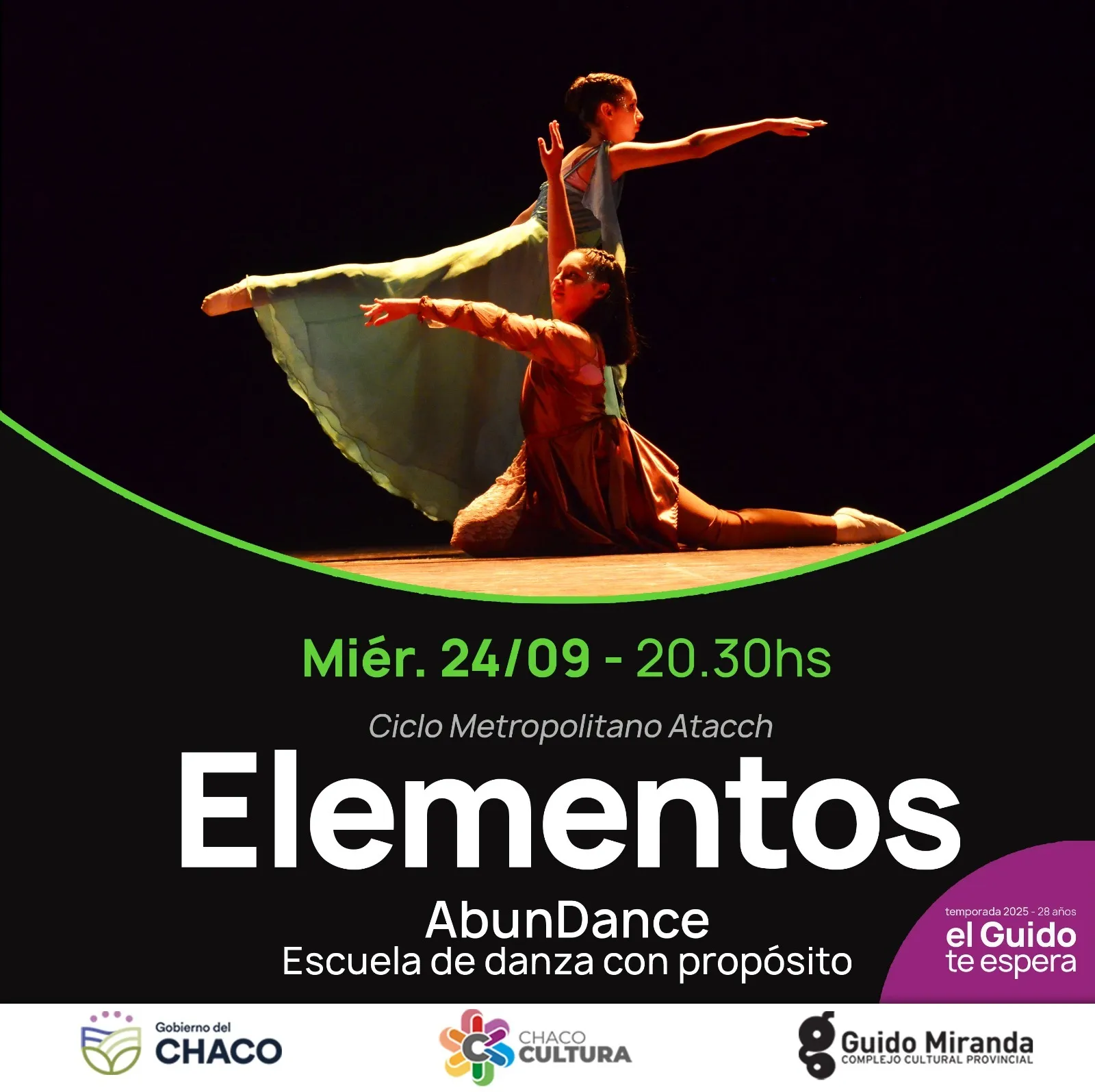 El miércoles 24 de septiembre, a las 20.30, en el Complejo Cultural Guido Miranda (Colón 164), dependiente del Instituto de Cultura del Chaco, la compañía AbunDance (Escuela de danzas con propósito) presentará la obra “Elementos”.