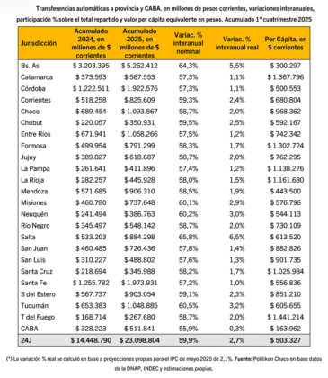 Durante mayo de 2025, las transferencias automáticas de Nación a provincias y CABA sumaron $5,57 billones, lo que representa una caída real del 23,3% interanual, según un informe de Politikón. Esta baja se explica por la comparación con mayo de 2024, cuando hubo un pico extraordinario por el cobro de anticipos del impuesto a las ganancias, inflado entonces por la devaluación y la revalorización de activos dolarizados en empresas.