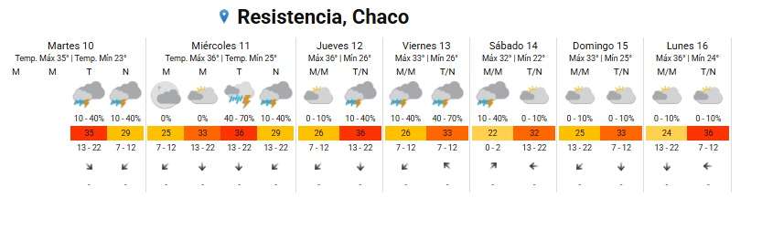 Jueves 12: Se mantiene el ambiente pesado con una máxima de 36°C y una mínima de 26°C. Se prevén tormentas aisladas hacia la tarde/noche con una probabilidad del 10% al 40%.