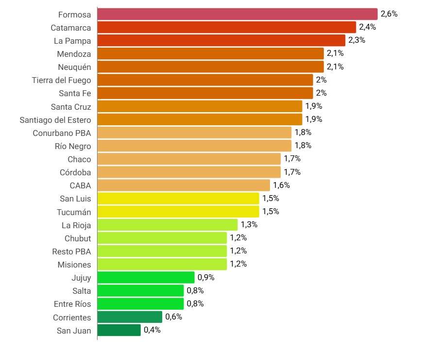 Mayores subas porcentuales: Formosa lideró los aumentos con un +2,6%, seguida por Catamarca (+2,4%) y La Pampa (+2,3%).