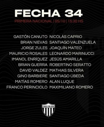 El once inicial será: Gastón Canuto; Mauricio Rosales, David Valdez, Mathias Silvera y Alan Luque; Santiago Valenzuela, Maximiliano Romero, Santiago Úbeda y Joaquín Mateo; Leonardo Marinucci y Matías Romero.