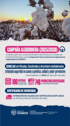 Esta iniciativa ofrece bolsas de semillas certificadas, fiscalizadas y de primera multiplicación con una bonificación del 60% sobre su precio de mercado, facilitando así la siembra de la campaña algodonera 2025/2026.
