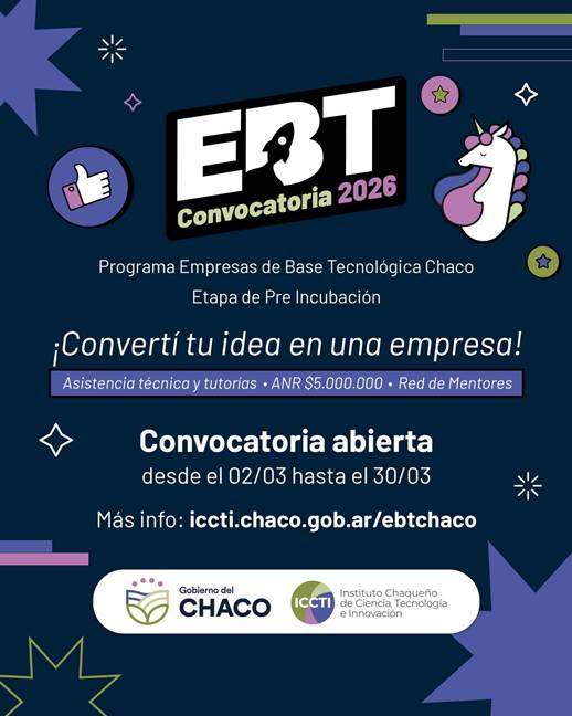 El Gobierno del Chaco, a través del Instituto Chaqueño de Ciencia, Tecnología e Innovación (ICCTI), presentó la edición 2026 del programa Empresas de Base Tecnológica (EBT Chaco), una iniciativa orientada a potenciar proyectos científicos y tecnológicos con proyección de mercado.