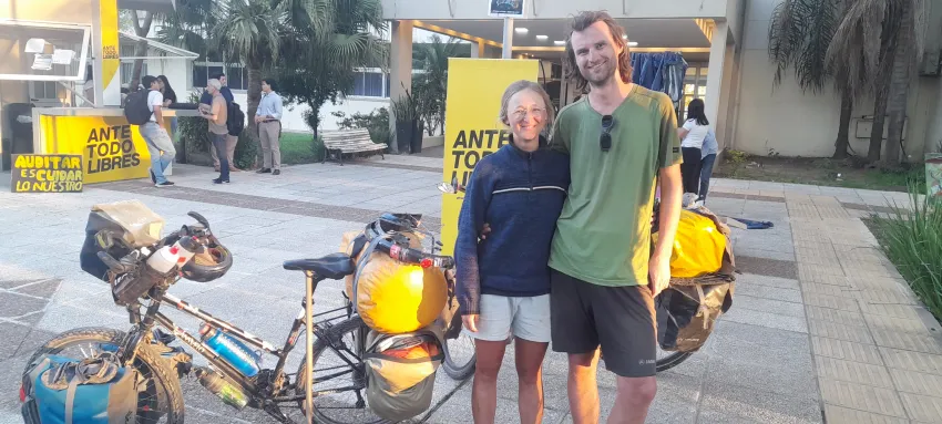 Francisca y Nicolas, dos jóvenes alemanes, hicieron una pausa en la ciudad de Corrientes durante su travesía en bicicleta por América Latina.