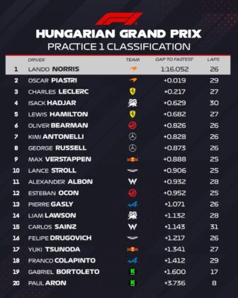 Franco Colapinto finalizó en la 18ª posición durante la primera práctica del Gran Premio de Hungría de Fórmula 1, celebrada el 1 de agosto de 2025 a las 09:44. El piloto argentino de Alpine quedó por delante de los Kick Sauber de Gabriel Bortoleto y Paul Aron, quien sufrió un fallo eléctrico tras solo siete vueltas.