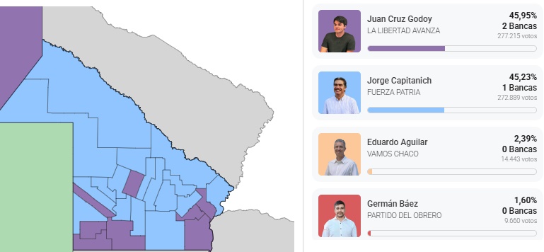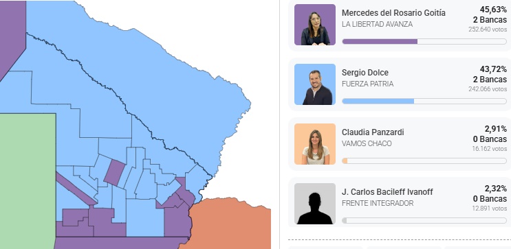 Más atrás se ubicaron las demás fuerzas políticas: Vamos Chaco obtuvo el 2,92% de los votos, seguido por el Frente Integrador con 2,33%, mientras que Partido Obrero, Nepar y Proyecto Sur no lograron representación legislativa.