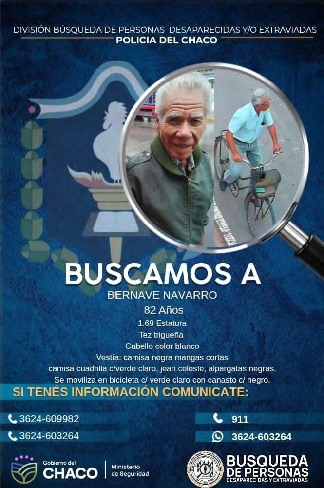 Bernabé Navarro fue visto por última vez el domingo por la tarde en el barrio San Martín de Sáenz Peña. La Policía del Chaco desplegó un operativo cerrojo y rastrillajes en toda la zona interior para hallarlo.