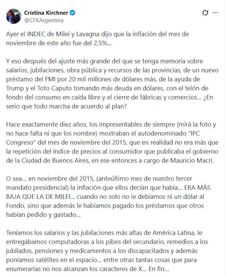 Tras el informe del Indec que ubicó la inflación de noviembre en 2,5%, Cristina Kirchner criticó duramente la política económica del gobierno libertario de Javier Milei. Desde su casa de prisión domiciliaria en San José 1111, la expresidenta cuestionó el impacto de los ajustes sobre salarios, jubilaciones, obra pública y recursos provinciales, así como la toma de deuda con el FMI y la caída del consumo y la actividad industrial.