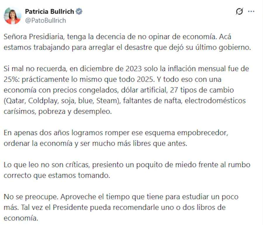 Bullrich recordó que en diciembre de 2023 la inflación mensual llegó al 25% y que el país sufría con precios congelados, múltiples tipos de cambio, escasez de productos y altos niveles de pobreza y desempleo. La legisladora afirmó que, en apenas dos años, la actual administración logró “ordenar la economía y dar mayor libertad económica” y sostuvo que los comentarios de Cristina reflejan temor frente a las medidas del Gobierno.