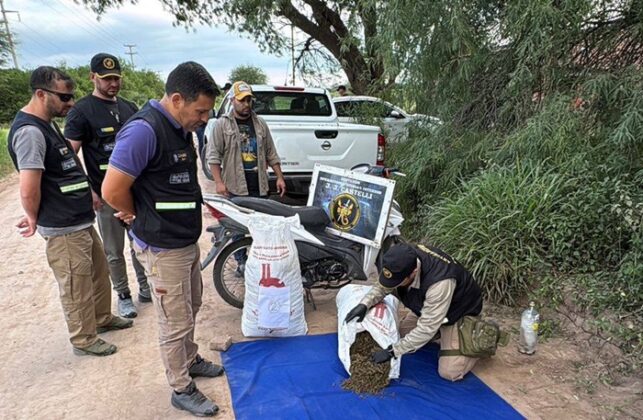 Con la presencia de testigos, se verificó el contenido de los bultos, constatándose que se trataba de 30 kilogramos de cogollos de marihuana distribuidos en dos bolsas tipo arpillera con inscripciones de “Tucumán Zafra 2023”. Además, se secuestró una motocicleta 110 cc, $50.000 en efectivo y una credencial de una organización comunitaria.