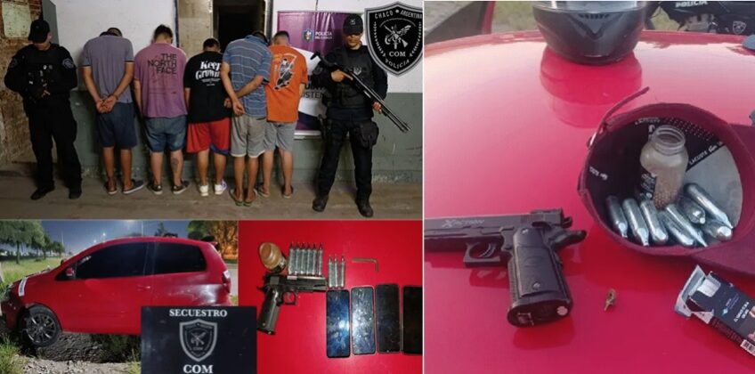 Los detenidos fueron identificados como F.M.A. (22 años), F.M.E. (23), P.A.J. (22), C.J.J. (22) y L.J.S. (26). Se procedió al secuestro del vehículo y del arma, una pistola de aire comprimido calibre 4.5 mm. Los involucrados quedaron a disposición de la justicia.