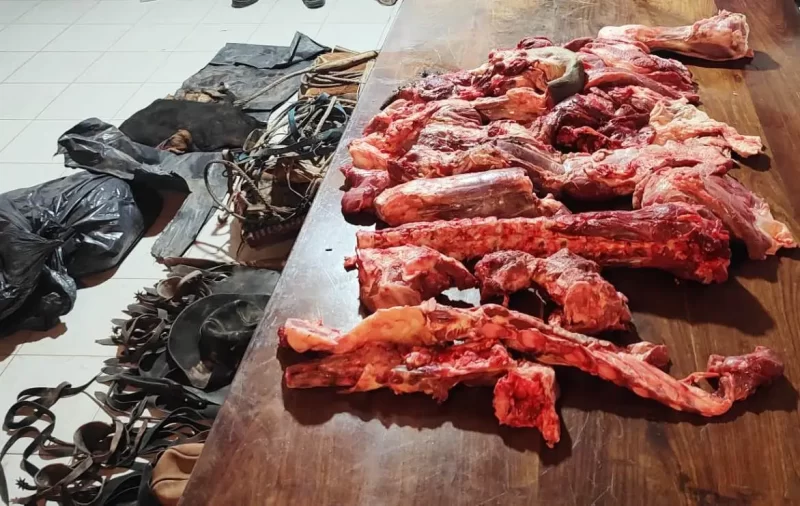 En su poder secuestraron 50 kilos de carne, dos cueros de animales vacunos, lazos con sangre, y dos equinos en los que se movilizaban. Los cuatro hombres de 38, 42, 27 y 29 fueron conducidos y notificados de su aprehensión en la causa Supuesto Abigeato