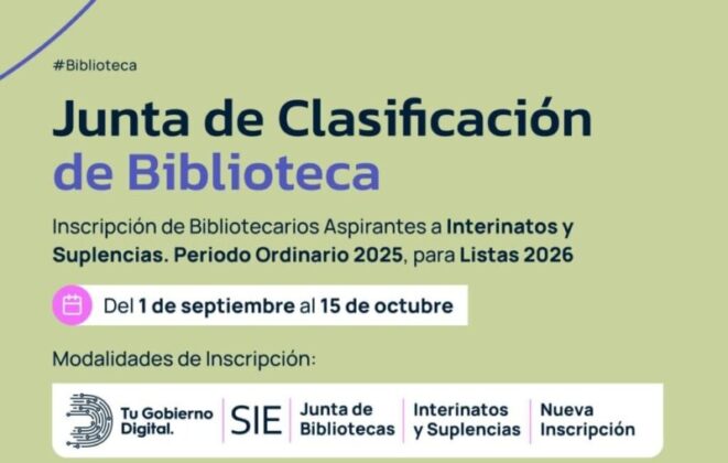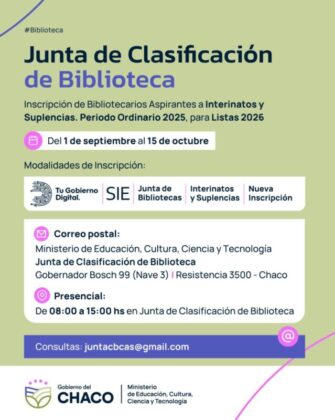 El Ministerio de Educación del Chaco, a través de la Junta de Clasificación de Bibliotecas, informó que a partir del 1 de septiembre y hasta el 15 de octubre estará abierta la inscripción para docentes bibliotecarios interesados en interinatos y suplencias, correspondientes al Periodo Ordinario 2025 para listas 2026.