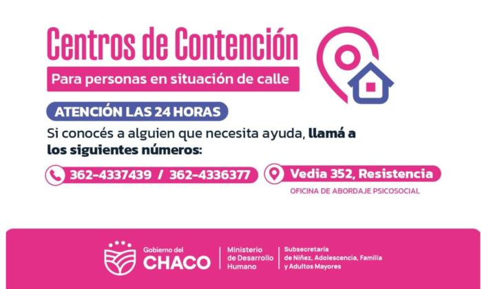 El Ministerio de Desarrollo Humano informa que, ante la ola de frío invernal, se encuentran cupos disponibles para el alojamiento y contención de personas en situación de vulnerabilidad social como es la de situación de calle. Las líneas telefónicas móviles para dar aviso son: 362-4337439 y 362-4336377.
