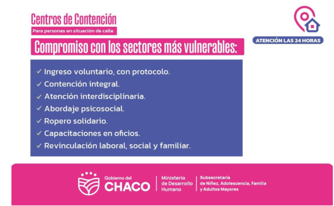 La oficina de atención interdisciplinaria está sita en la calle Vedia 352, de Resistencia, allí se evalúa por protocolo cada situación y se define la forma de alojamiento o tratamientos a seguir para quienes necesiten de un techo para cobijarse en una primera instancia, para que puedan recuperarse y revincularse posteriormente con los distintos entornos, ya sean sociales, laborales y familiares.