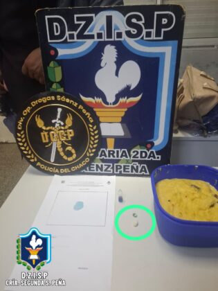 Ayer, a eso de las 21:15, dos mujeres de 21 y 38 años, se presentaron en la Comisaría Segunda de Sáenz Peña para entregar alimentos a un detenido. Tras la de revisión los agentes detectaron en el interior de un taper con polenta dos envoltorios de nylon trasparente con sustancia blanquecina similar a cocaína. Inmediatamente se dio intervención a la División Operaciones Drogas Interior Sáenz Peña, que confirmó mediante pruebas que se trataba de cocaína, con un peso total de 0,9 gramos.