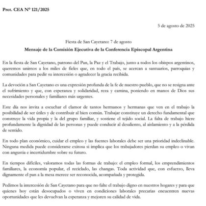 En vísperas del 7 de agosto, día de San Cayetano, patrono del pan y el trabajo, la Conferencia Episcopal Argentina emitió un comunicado en defensa del trabajo, reclamando al Gobierno que proteger el empleo sea una prioridad central en cualquier estrategia económica.