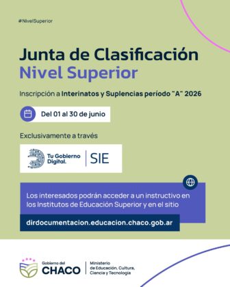 El Ministerio de Educación, a través de la Junta de Clasificación de Nivel Superior, comunica a los Institutos de Educación Superior (IES) de la provincia del Chaco y a los docentes interesados que del 1 al 30 de junio, inclusive, se encuentra habilitada la inscripción para Interinatos y Suplencias correspondiente al Período “A” del ciclo lectivo 2026.