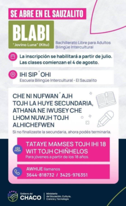 La subsecretaria Coria informó que las inscripciones se encuentran abiertas desde el 1 de julio, en esta semana, y que las clases comenzarán el 4 de agosto, por lo cual invita «tanto a jóvenes wichí como no wichí a que puedan inscribirse y así terminar su escuela secundaria».