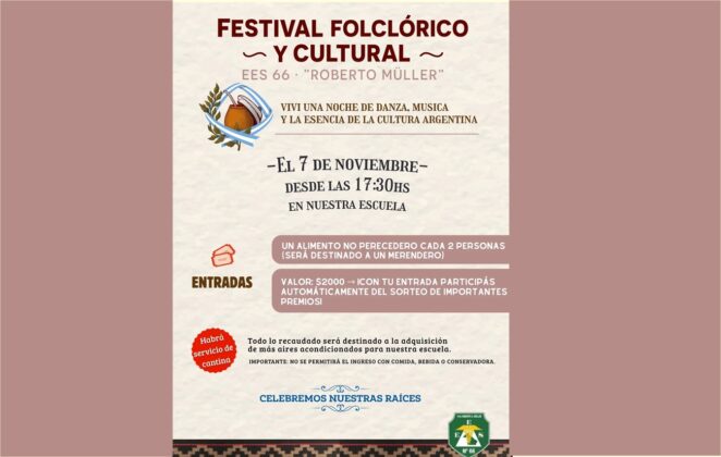 La Escuela de Educación Secundaria N° 66 «Roberto Muller», ubicada en avenida San Martín 602, Resistencia, prepara un festival folclórico y cultural el próximo 7 de noviembre desde las 17:30, con el objetivo de recaudar fondos para la compra de aires acondicionados para sus aulas. Actualmente, la institución cuenta con 31 aulas, de las cuales solo seis poseen equipos de climatización.