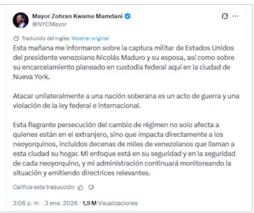 A través de un mensaje publicado en sus redes sociales oficiales, Mamdani sostuvo que el accionar estadounidense constituye “un acto de guerra y una violación de la ley federal e internacional”, al tratarse de un ataque unilateral contra una nación soberana.