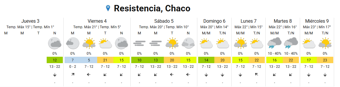 El Servicio Meteorológico Nacional emitió el cese del alerta por frío en el Chaco, y anuncia buenas condiciones del tiempo. Así, en Resistencia y alrededores, se prevé para este viernes cielo algo nublado por la mañana, y parcialmente nublado por la tarde-noche, con una temperatura mínima de 5 grados y 21 de máxima.