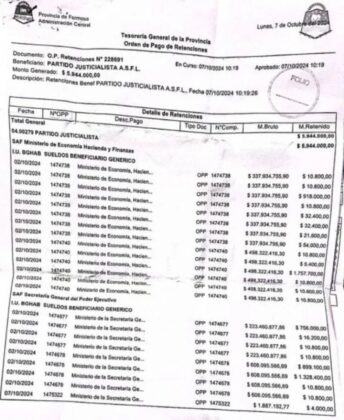 Según la denuncia, el gobierno provincial habría emitido cinco órdenes de pago por un total de 1.660 millones de pesos bajo el concepto de “Haberes”, utilizando información falsa para canalizar los fondos al Partido Justicialista de Formosa. Un caso señalado es el de una transferencia de 5.944.000 pesos etiquetada como destinada a una Asociación Sin Fines de Lucro (ASFL), cuando el número de CUIT correspondía en realidad al PJ local.