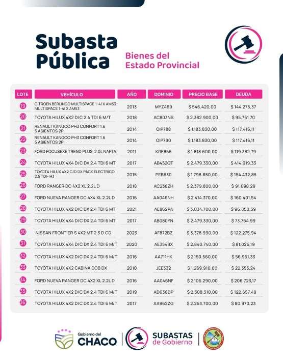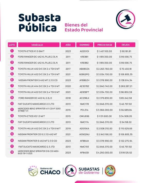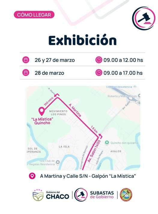 Por otra parte, se informó que los interesados podrán acceder a la exhibición previa de los bienes los días 26 y 27 de marzo, de 9:00 a 12:00 horas, y el 28 de marzo, de 9:00 a 17:00 horas, en el predio ubicado sobre avenida Martina y calle S/N, en el galpón “La Mística”.